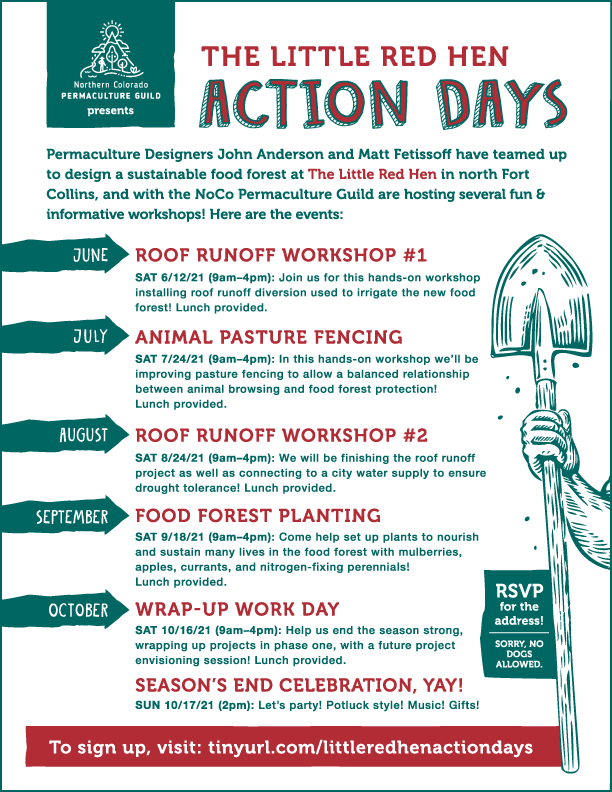 We plan and participate in permaculture based projects for folks in the Northern Colorado area, setting up blitz-style action meetups where many hands make light work, often with an educational piece, sharing the design thinking process with members and volunteers while enjoying communal meals prepared by a site host at the location of our work.